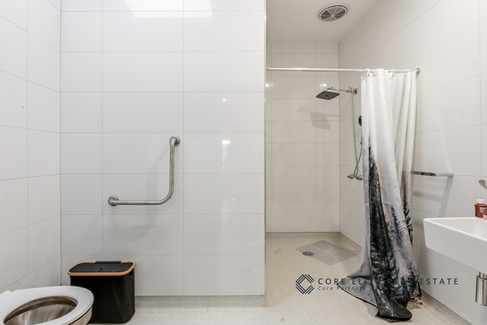 住宅设有三间宽敞卧室,均配备内置储物空间及完善的卫浴设施。三间浴室均采用无台阶淋浴设计,并配备安全扶手,整体为全墙面瓷砖铺设(至顶),同时卫生间配有天窗(skylight),增强采光。全屋约2700mm层高,结合920mm加宽门道设计,使空间更易通行;无台阶及坡道式出入口进一步提升整体无障碍条件。
